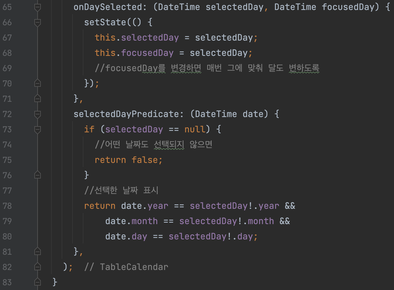 앞서 지정해 준 focusedDay 변수를 selectedDay로 해주면 매번 그에 맞춰 달도 변한다